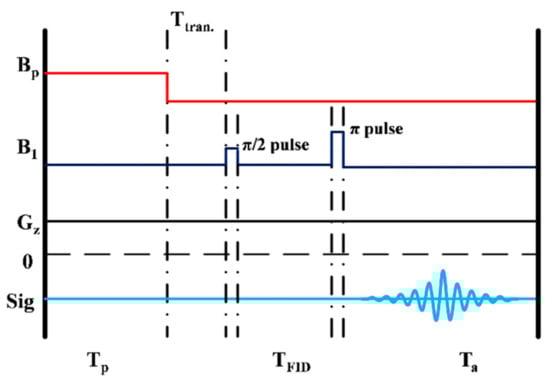 The experiment starts by prepolarizing the sample in the permanent magnet pair for a time Tp = 5 s, as shown in Figure 2. After prepolarization, the sample is transported to the outer bottom of the dewar in a transportation time of Ttran = 550 ms. In order to get the NMR signal at the Larmor frequency fL of 5 kHz (B0 =117 μT), a π/2 and a π excitation field pulse are applied as excitation (B1) fields. TFID is the time when the free induction decay (FID) signal relaxes completely. We record the signal with the frequency encoding gradient Gz switched on to bring down the SNR to a low level on purpose, e.g., to obtain an SNR of about one, in order to study the efficiency of our de-noising approach. The SQUID readout electronics is kept in the reset state during 2 ms of delay time after finishing the π pulse. Subsequently, spin echoes are recorded for a duration of Ta.