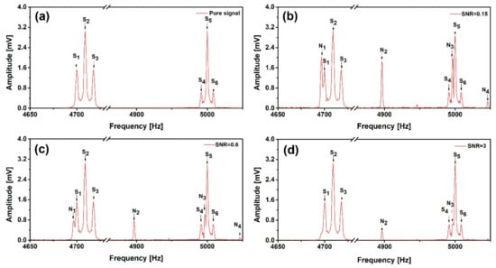 We firstly verified the effectiveness of the two noise suppression algorithms using a simulated spin echo signal with two different groups, as shown in Figure 3a, whose strength distributions are 1:2:1 (S1–3), and 1:5:1 (S4–6), respectively. The duration of the simulated signal is 0.45 s and the data acquisition time is 1 s. To simulate the practical noise performance, we added some real noise picked up by the reference sensor, which contains both white noise and power-line interferences, with different noise strengths to achieve different SNR. The noise-added signals are depicted in Figure 3b, c and d, with SNR = 0.15, 0.6 and 3, respectively. Using these artificial signals covered with real noise, we can verify the de-noising effectiveness in case of low SNR. We use the ratio of the energy spectral density integral under the smallest signal peak (S4) and one of the strongest harmonic peaks (N2) which doesn’t overlap with the signal peaks, for determination of the SNR.