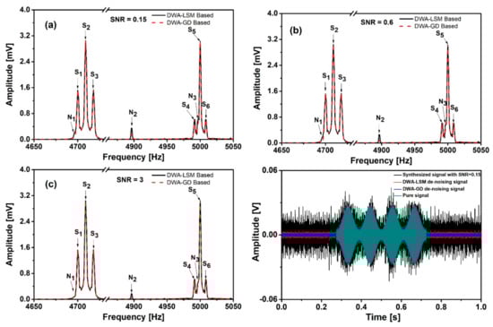 The noise of the synthesized signals was suppressed based on the two algorithms described in Section 2.2. Figure 4a–c show the noise suppression effects for different values of SNR. We can see that the noise peaks are greatly suppressed. In the case of lowest SNR, N1–3 have been suppressed by a factor of 88%, 83% and 85%, respectively, by using DWA-LSM. By using DWA-GD, N1–3 have been suppressed by a factor of 95%, 90% and 90%, respectively. The suppression factors can be calculated by two steps: (1) Calculate the residual noise defined as the difference between de-noised signal and pure signal. (2) Calculate the suppression factors by using the residual noise spectrum and pure noise spectrum. Figure 4d shows the signals with SNR = 0.15 before and after de-noising and the pure signal in time domain. It clearly illustrates the noise reduction in time domain. Table 1 shows the SNR changes during the de-noising process for different values of SNR. In all cases, the SNR has been significantly improved. Compared with LSM, GD yields further noise suppression. However, the GD consists of several steps and the process takes 10 min in case of SNR = 0.15, and several minutes in the other two cases (10,0000 data points). This is because the initial value of the added noise is different when we use the same step length to converge to the optimal point. A larger initial value will even take more time. For comparison, the LSM process can be finished within ten seconds. The number of data points also influences the computing time, based on the Bachmann-Landau notation []. When the data points double, the computing complexity will be 4 times longer than before since both the GD and the LSM involve square operations. Furthermore, the result is very sensitive to the step length set in the GD. If the step size is too large, the output might not converge to the optimal solution. If the step is too small, the convergence will be very slow. The SNR is limited by the residual noise whose amplitude is about 5% of the original noise amplitude in Figure 3b. The accuracy of the loss function and the step length are the main reasons that limit further noise reduction. However, higher accuracy and smaller step length will take more time and memory. In practical application, if the amplitudes of the noise peaks are significantly smaller than the amplitudes of the signal peaks, comparable to the white noise, a lower accuracy is acceptable.