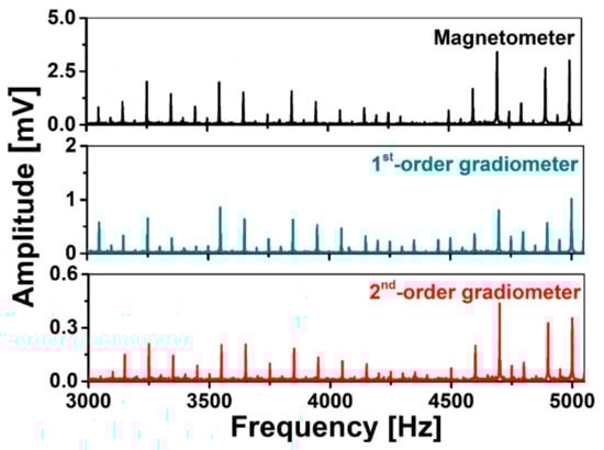 Firstly, we study the spectral correlation among the noise spectra of the different sensors, the magnetometer, the 1st- and 2nd-order gradiometers, between 3 and 5 kHz, as shown in Figure 5. The results show that there are two harmonics every 100 Hz, so if the signal bandwidth or J-coupling bandwidth is more than 50 Hz, the interference will overlap with the signal spectrum. The noise spectral correlation coefficient among the detectors can then be calculated by using the Pearson correlation coefficient (PCC), as shown in Table 2. The PCC is a measure of the strength of the association between two variables []. The number between −1 and 1 indicates the extent to which two variables are linearly related. The values of 1 and −1 imply complete positive and negative correlations, respectively. A value of 0 implies that the two variables are uncorrelated. We found correlation coefficients above 0.89, and the correlation coefficient between the magnetometers and the second-order gradiometer reached a value of 0.97. This means that the frequencies of the harmonics picked up by different sensors are the same, and the relative output amplitudes of the harmonics from each sensor are similar. Although the values of the correlation coefficients will change with the measurement position, all the three coefficients at the three measurement positions amount to more than 0.80. In order to achieve a good spectral correlation coefficient, the measurement system should be located far away from near-field sources (e.g., neighboring electronic devices).