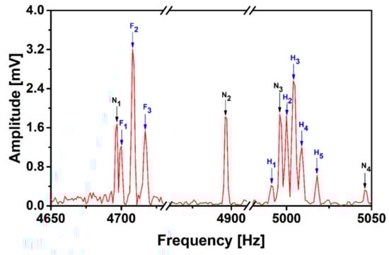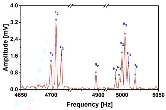 Based on the good spectral correlation between the 2nd-order gradiometer and the magnetometer, we choose the 2nd-order gradiometer as the signal sensor to record spin echo signals of 20 mL 2,2,2-trifluoroethanol at 5 kHz proton Larmor frequency. The power-line harmonics interferences are recorded by three orthogonal magnetometers at the same time. In order to verify our de-noising method at low SNR, we implement a 2 µT/m frequency encoding gradient during the measurement to reduce the SNR. Figure 6 shows the heteronuclear J-coupling spectra of the 2,2,2-trifluoroethanol NMR signal and the 50 Hz harmonics interferences between 4650 and 5050 Hz which are picked up by the signal sensor. The fluorine and the proton groups of peaks are well separated, with center frequencies of about 4708 Hz and 5004 Hz, respectively. The linear broadband detector SQUID can easily record the signal groups from two different nuclei. We can clearly observe 3 fluorine peaks (F1–F3) and 5 proton peaks (H1–H5). As expected, the strength distribution of 1:2:1 for triplet fluorine peaks due to the coupling of the three fluorine nuclei with the two protons can be easily observed. The OH is uncoupled, so the proton spectrum appears as five proton peaks. The proton-fluorine coupling strength is about 9 Hz, which is in good agreement with measurement results at high-field [] and in the earth’s magnetic field []. The line width of the NMR spectra is 1 Hz, which is limited by the data acquisition time 1 s and by the frequency encoding gradient. However, the interferences (N1–N3) destroy the spectrum of the fine structure of matter and make it impossible to get accurate parameters and structure estimation from the NMR spectrum. We also use the ratio of the energy spectral density integral under each signal peak and N2 for determination of SNR. For most of the signal peaks, the SNR is much less than 1.