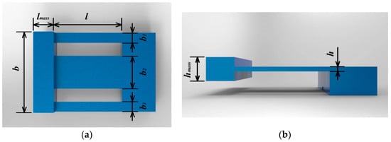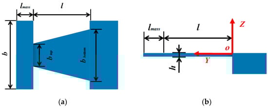 In this step, beam 2 was modeled as a constant-section beam to simplify the process of parameters optimization, as shown in Figure 3. According to the theory of vibration [24], the vibration amplitude of the beam increases with its decreasing thickness when mass is constant. Considering the strength of the beam and processing cost, thickness (h) and length (l) were set as 0.5 mm and 10 mm, respectively, to achieve miniaturization.