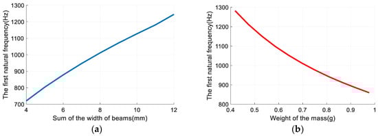 Optimized width of beams and weight of mass. (a) The first natural frequency changes with the sum of the width of beams when the mass is 0.7 g; (b) The first natural frequency changes with mass when the sum of the width of the beams is 8 mm.