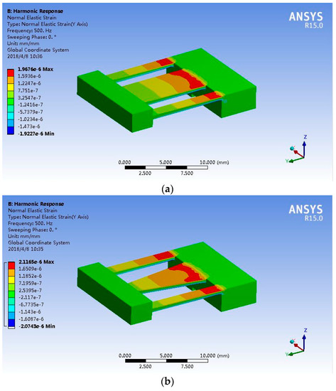 Strain distribution obtained by finite element analysis (FEA). (a) Constant-cross-section beam; (b) Optimized trapezoidal beam.