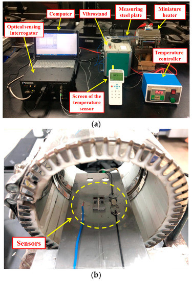 The experimental setup is shown in Figure 7a. A “SM130--700” dynamic optical sensing interrogator (1-kHz scanning frequency on 4 parallel channels simultaneously) was used to demodulate signals obtained by FBGs and strain gage. The vibration, strain, and temperature data were recorded and analyzed by the interrogator on a desktop computer. A vibrostand (SS-VSC-1) was used to generate vibrations. One end of the steel plate was attached to the vibrostand. Nuts were glued to the other end of the plate to generate surface strain. The sensors were attached onto the surface of the plate using a high-temperature-resistant glue (OMEGABOND “600”). Part of the plate and sensors were placed inside a miniature heater, as shown in Figure 7b and a temperature controller was used to control the temperature inside the miniature heater.