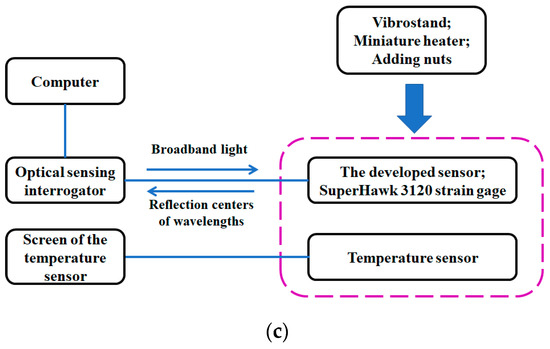 A schematic block diagram of the setup is provided in Figure 7c. The broadband light provided by the optical sensing interrogator was transmitted to the newly developed sensor and the SuperHawk 3120 strain gage via optical fibers. Then, the reflection center wavelengths were transmitted back to the interrogator via the same optical fibers and the output data were recorded and analyzed on the computer. Changes in temperature, vibration, and strain were achieved by using a miniature heater, vibrostand, and adding nuts, respectively.