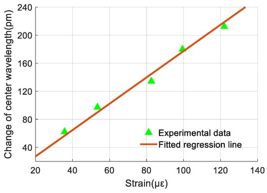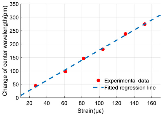 Equation (6) shows that the sensitivity of FBG 1 for strain measurement is 1.878 pm/με. Figure 8 presents the experimental data of FBG 1 and the fitted regression line. The maximum strain measured in this work was 152 με.