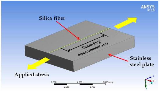 The FBG has an elastic modulus of 72 GPa and a diameter of 0.125 mm, which is too small to disturb the strain distribution of the measured object, thus, the measured strain is the real surface strain of the object. To verify this conclusion, FEA was carried out. Briefly, the measured object was set as a stainless-steel plate with dimensions 15 mm × 12 mm × 2 mm. A 15-mm-long silica fiber was glued onto the surface of the steel, as shown in Figure 9.