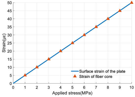 By applying different values of stress to the plate, the strain within the 10-mm-long measurement area in the middle of the fiber was simulated. Compared to surface strain on the plate without the fiber, the maximum deviation in strain is shown in Figure 10. From the figure, strain of fiber core fits very well with the surface strain of the plate. The maximum deviation appears at 8 MPa and is 0.188% which is much smaller than the nonlinearity error of the strain measurement. Thus, the deviation between strain at the FBG core and on the surface of the measured object can be ignored. Strain measured by FBG 1 represents the real surface strain of the object.