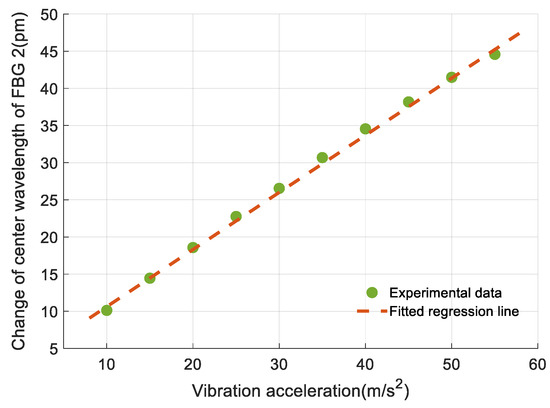Equation (11) shows that the sensitivity of FBG 2 for vibration measurement is 0.769 pm/m·s−2. Figure 12 shows the experimental data of FBG 2 and its fitted regression line. The nonlinearity error of FBG 2 for vibration measurement is obtained according to Section 3.1.1 and experimental data and it is 1.83% F.S. at 40 m/s2.