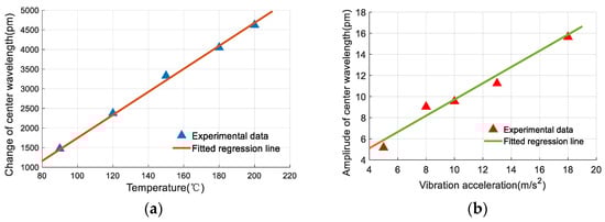 The performance of the sensor for individually sensing strain was obtained using Equation (6). The sensitivity and nonlinearity error in the working range of 0–152 με were 1.878 pm/με and 2.43% F.S., respectively. The temperature sensing performance can be represented as in Equation (8). The sensitivity and nonlinearity error in the working range of 50–210 °C were 29.324 pm/°C and 1.88% F.S., respectively. Finally, the performance of vibration sensing was determined by Equation (11). The sensitivity and nonlinearity error in the working range of 10–55 m/s2 were 0.769 pm/m·s−2 and 1.83% F.S., respectively.