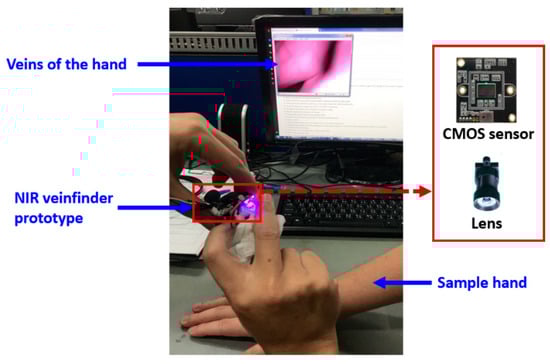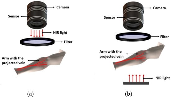 A basic prototype vein finder is composed of a high power NIR-LED as the light source, a compact infrared-sensitive camera, sensor that will capture and format the image and a filter to remove unwanted impurities [29,30,31,32,33,34] (see Figure 2). Other prototypes were incorporated with additional parts by the researchers for enhancement purposes, like the use of a Digital Light Processing (DLP) projector that allows vein image on the surface of the skin [35].