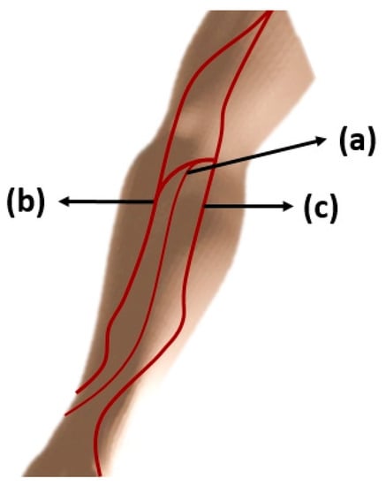 The preferred venipuncture sites include the antecubital fossa and the back of the hand that has the superficial vein. Veins are blood vessels that aim to return the blood to the heart. It has a higher percentage of deoxygenated blood (deoxyhemoglobin) as compared to arteries that have higher level of oxygenated blood (oxyhemoglobin) [33]. Hemoglobin (Hb) is the primary component of the blood, specifically; of the red blood cells that have the oxygen carrying capacity [67]. There are three veins that can be selected. Among the three are the veins in the median aspect (center of the arm) must be the first choice followed by the veins in the lateral aspect (outer thumb side), i.e., the cephalic vein, and last are the veins in the medial aspect (inner little finger side), i.e., the basilic vein [68]. Figure 5 shows the main veins of the antecubital fossa (a) median cubital vein, (b) cephalic vein, and (c) the basilic vein. The median cubital vein is considered as the best site for venipuncture. It lies over the cubital fossa and serves as a branching between the cephalic and basilic veins [21]. Compared to the two other sites it is well anchored vein, usually large and prominent [69].