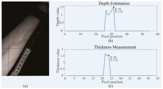 (a) Selecting a point from fused images to extract values of: (b) Depth and (c) thickness using the proposed imaging system [71].