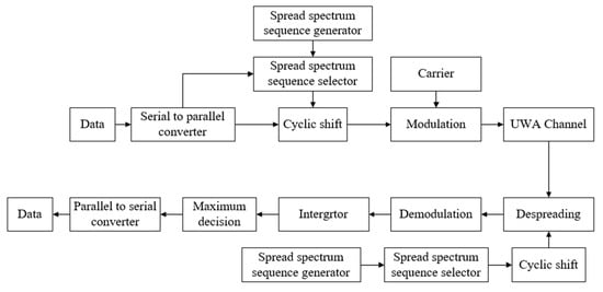 To cope with challenging UWA channels, researchers have proposed several algorithms and communication techniques [4,5,6,7]. For the multipath interference and the low signal-to-noise ratio (SNR) in UWA communications, a commonly used technique is the spread spectrum communication [8,9]. The spread spectrum method is a type of transmission, in which the bandwidth occupied by the signal exceeds the minimum bandwidth required to transmit information [10]. Traditional spread spectrum communications include Direct Sequence Spread Spectrum (DSSS), Frequency Hopping Spread Spectrum (FHSS) and Time Hopping Spread Spectrum (THSS), where DSSS is used more commonly due to its resistance to frequency selective fading [11]. DSSS technique promises high reliability but at the cost of a lower communication rate because it uses one sequence to spread only 1 bit of information [12]. In order to improve the performance of the DSSS system, a new M-ary cyclic shift keying spread spectrum (MCSK) technique is thus proposed, which can not only guarantee the high reliability but can also improve the communication rate to a significant extent.