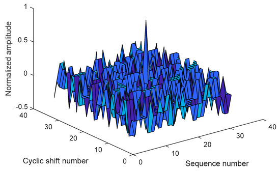 As shown in Figure 2, varies with and , where represents the sequence number and represents the cyclic shift number. Because of the good autocorrelation characteristic of spread spectrum sequences, the spread spectrum sequence corresponding to the transmitted information can be found by searching for the maximum value in . After the received signal is despread by the corresponding sequence and demodulated by the local carrier, the original information is restored by parallel to serial conversion.