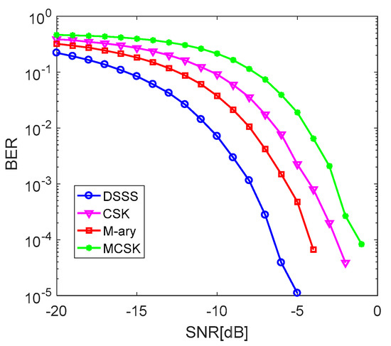 From the BER curves of these four systems in Figure 3, it can be seen that the anti-noise performances of them are arranged from high to low in order: DSSS system, M-ary spread spectrum system, CSK spread spectrum system, MCSK system. Compared with DSSS, the other three methods change from the single sequence decision to the multi-sequence decision, which results in the cross-correlation interference of othefr sequences. In the other three systems, the increase in communication rates is at the cost of reducing reliability. The total number of spread spectrum sequences in the MCSK system is the largest, that is, the cross-correlation interference at the receiver is the most serious, so the anti-noise performance of the MCSK system is the worst.