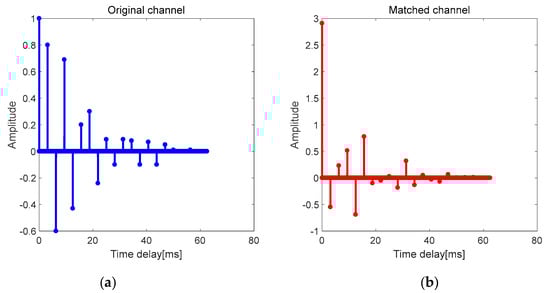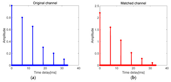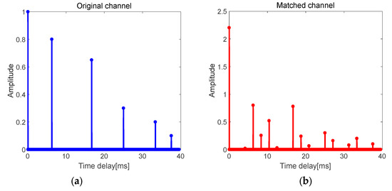 If the structure of the multipath channel is assumed as shown in Figure 7a, where , each item in is added to each item in , which will increase the energy of all paths. The primary–secondary peak ratio of this matched channel is equal to the original channel. Therefore, TRM is not suitable for similar structure channels.