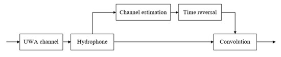 In the VTRM technique, the signals are one-way transmission in the UWA channel [24]. VTRM uses the received detection signal to estimate the channel and reduces the complexity of communication systems. The diagram of the VTRM is shown in Figure 8, and the algorithm of VTRM is shown in Algorithm 1. After passing through the UWA channel, the received detection signal is used to get the CIR with the appropriate channel estimation method at the receiver. Then, the convolution of the received signal and the estimated time-reversal channel is completed.