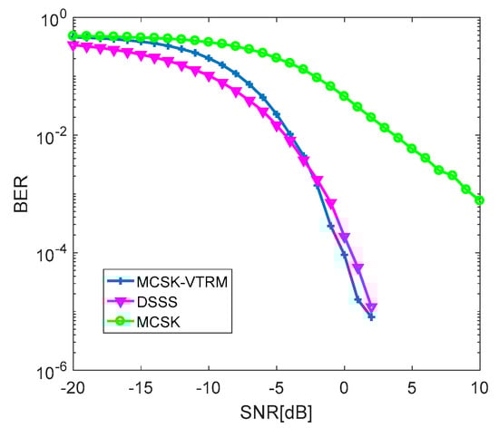 The simulation conditions are given in Table 3. Assuming that the CIR is known, the reliability of the traditional DSSS system, MCSK system, and MCSK-VTRM system is compared in Figure 10. In all these systems, the spread spectrum sequences are composed of kasami sequences and their cyclic shift sequences. Each system transmits 1000 bits of data each time and repeats 200 experiments. In the MCSK system and the MCSK-VTRM system, one spread spectrum sequence carries 5 bits of information.