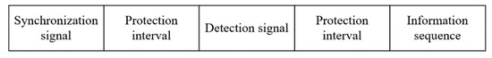 In practice, the CIR of the UWA channel is unknown. To utilize VTRM to compensate the influence of the UWA channel, the received detection signal is first used to estimate the CIR of the UWA channel at the receiver. As shown in Figure 11, a transmitted signal is composed of a synchronous signal, a detection signal, some protection intervals and a spread spectrum signal which carries information. The synchronous signal is usually the linear frequency modulation signal, and the detection signal can choose the linear frequency modulation signal or other training sequences.