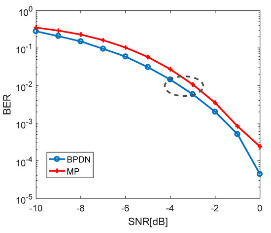The BER curves of the MCSK-VTRM system with the MP algorithm and SpaRSA algorithm based on BPDN estimating CIR are shown in Figure 12. It can be seen that when the SNRs are the same, the BER of the system using BPDN is slightly lower. Compared with BER of MP, that of BPDN is lower about 0.5 dB when BER is . The performance of BPDN channel estimation is better than that of MP channel estimation, but the BPDN algorithm has a large amount of computation and a long operation time.