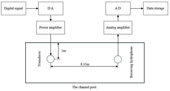 To verify the performance of the proposed MCSK-VTRM system, an experiment was also carried out in January 2018 in the channel pool of Harbin Engineering University. The pool is 45 meters long, 6 meters wide and 5 meters deep. It is surrounded by silent wedges and has a sandy bottom. Both the transducer and the receiving hydrophone used in the experiment are omnidirectional. They were placed 2 meters below the water surface, and the horizontal distance was 8.35 meters. We used Cool Edit Pro to send and receive signals, and the structure of the transmitted signal is as shown in Figure 11. Figure 13 shows pictures of experiment equipment and Figure 14 shows the layout of the experiment site.
