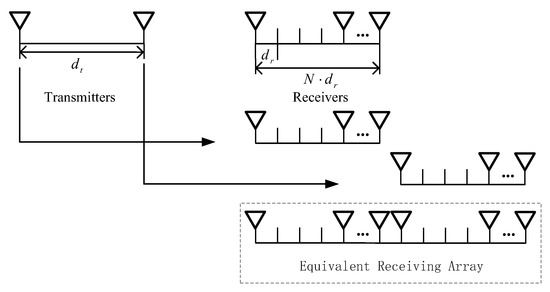 As shown in Figure 1, the Tx and Rx can be equivalent to a virtual array containing elements with an array aperture of . The MIMO system takes fewer array elements than a conventional system, such as the phased array system, but with larger array aperture. The ideal signal model of the radar system can be expressed as: