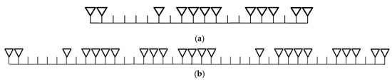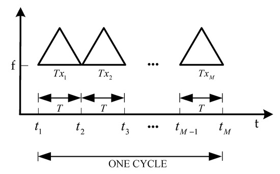 As seen in Figure 6, the system transmits the LFMCW signal, and the time duration of this LFMCW signal is . During the working period of each transmitting antenna, the LFMCW signal of one cycle is transmitted. After M transmitting antennas work in turn, a whole cycle of data acquisition is obtained. The echo signal received by the receiving antenna through M timeslot is equivalent to the data received by the sparse linear array of elements.