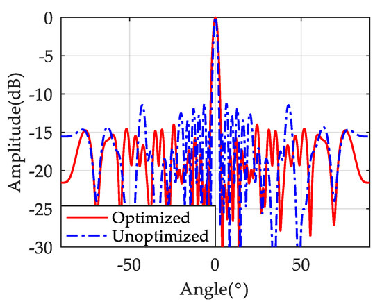 The optimized radiation pattern of the system compared with the ones of un-optimized array are shown in Figure 4, it can be seen that the maximum value of the side lobe is significantly decreased, with the main lobe almost unchanged.