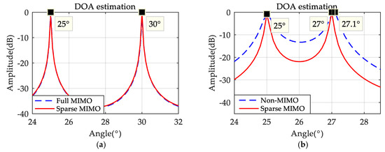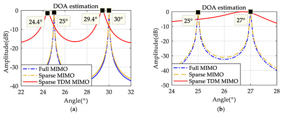 Next, the DOA performance of the system for detecting motion targets is simulated. The result is shown in Figure 8a, which shows that when detecting the target with high speed, the DOA estimation accuracy of the sparse TDM MIMO system is not as good as the ones of the sparse-array MIMO system and of the full MIMO system. Then the angle of the second target was changed to for another simulation, and the results are shown in Figure 8b. It can be found that when the targets get close, the DOA estimation performance of the sparse-array TDM MIMO system declines, and the adjacent targets cannot even be distinguished. This problem will be analyzed and solved in Section 3.3.