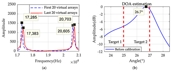 (a) FFT results of virtual arrays when targets in motion; (b) The DOA results before calibration.