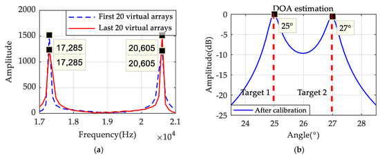 Simulations are carried out to observe whether the speed of the targets still affects the DOA result after the calibration. Assume there are two motion targets, and conditions are the same as mentioned above. The FFT results of half of the equivalent arrays are analyzed first. Figure 10a indicates the FFT results of the first, and the last equivalent array elements are consistent with each other, so there is no migration after the transformation method is taken. Figure 10b shows that two targets can be accurately detected when the signal is calibrated. The resolution and performance of DOA estimations are improved significantly with this method.