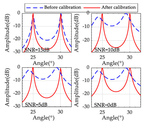 After calibration, the simulation of the sparse-array TDM MIMO radar system is carried out. Except for the velocity, angle, and SNR, the remaining conditions are the same as the previous simulation parameters. Setting the angles , , , , , and the targets velocities are . It can be seen from Figure 11 that the performance of DOA estimation is still good even under the low SNR condition after calibration.