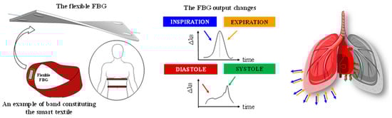 Breathing and cardiac activities can be monitored by several solutions [,]. Among them, smart textiles based on fiber Bragg grating sensors (FBGs) have gained broad interest to monitor the mentioned vital signs in an unobtrusive and comfortable way [,]. FBGs can be easily incorporated into textiles thanks to their small size and lightweight. In addition, the high sensitivity and adequate bandwidth make these sensors an optimal solution for such an application. Some potential drawbacks may include the difficulty to handle bare optical fibers, their tiny resistance to mechanical stress, and the requirement to be connected to an optical spectrum interrogator. The encapsulation of FBGs into soft and flexible polymer matrices allows for mitigating the mentioned limits [,,]. This solution makes easy to handle the fiber and improve the contact compliance with the body, leading to more accurate measurement of parameters from the chest surface movements. At the same time, recent progress towards the development of miniature FBG interrogation systems may broaden the application of FBGs for continuous and remote monitoring [].