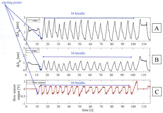 Outputs of the FBGs embedded into the smart textile and of the flow sensor on a whole experiment performed by a volunteer: (A) output changes of FBGA, placed in correspondence of the umbilicus; (B) output changes of FBGT, placed in correspondence of xiphoid process; (C) output of the flow sensor.