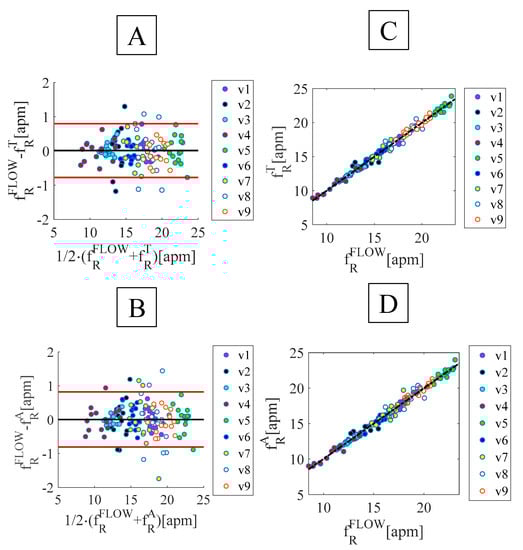 The respiratory periods (i.e., TRA and TRT for the band around the abdomen and the thorax, respectively, and TRFLOW for the flow sensor) were calculated as the time interval between two consecutive maximum peaks. Then, the fR values estimated by both the FBGs (i.e., fRA and fRT) and the flow sensor (i.e., fRFLOW) were calculated as the ratio between 60 and the related respiratory periods in order to express fR in acts per minute (i.e., apm).