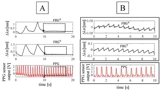 (A) Starting points selected on the synchronized signals and (B) zoom of the 10 s-window of apnea considering the outputs of FBGA, FBGT, and PPG.