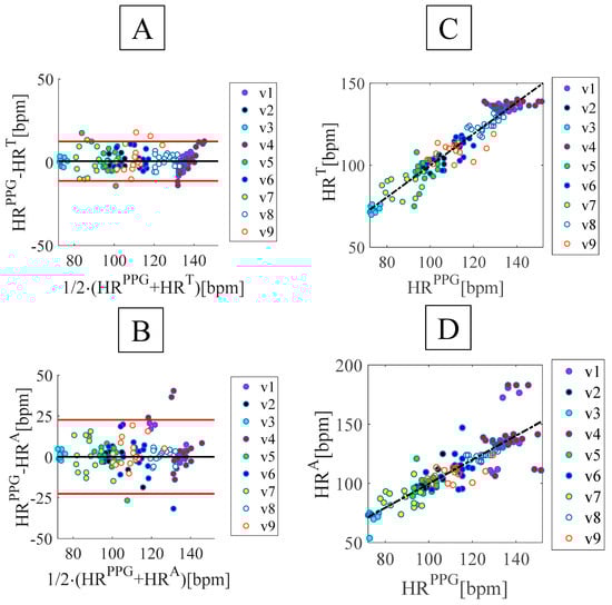 (A) and (B) Bland-Altman plots using FBGA and FBGT, (C) and (D) linear regression of the results obtained by FBGA and FBGT vs. the reference system.