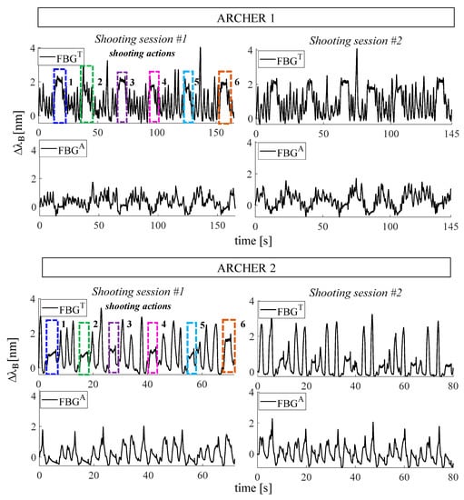 Outputs of the two flexible FBG sensors are shown for the four trials (2 shooting sessions for each archer). By way of example, the shooting actions of the first session are highlighted by dashed rectangular boxes.