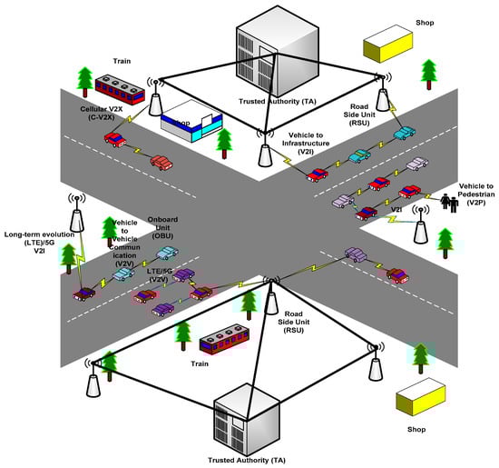 Generally, the communication between vehicles and RSU is done via the wireless technology called wireless access in the vehicular environment (WAVE). WAVE communication ensures the safety of passengers by updating vehicle information and traffic flow. It enhances the pedestrian and driver safety. It also improves the traffic flow and efficiency of the traffic management system. The VANET comprises of several units such as OBU, RSU, and TA. Specifically, the RSU typically host an application that is used to communicate with other network devices, and OBU was mounted in each vehicle to collect the vehicle useful information such as speed, acceleration, fuel, and more. Then, the information is forwarded to the nearby vehicles through a wireless network. All roadside unit (RSU) interconnected with each other is also connected to TA via a wired network. Additionally, TA is the head among all components, which is responsible for maintaining the VANETs [35].