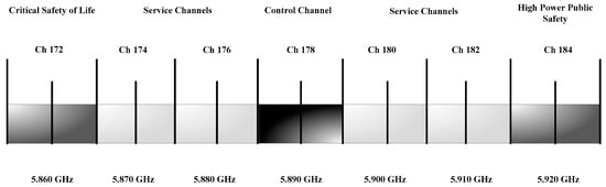 - Dedicated Short Range Communication (DSRC): DSRC is a wireless communication technology tool that permits vehicles to communicate with each other in ITS or other infrastructure such as V2V and V2I. In 1999, the Federal communication commission (FCC) allocated the band from 5.850 to 5.925 GHz, with a spectrum of 75 MHz for DSRC [59,60]. As shown in Figure 2, the spectrum of 75 MHz DSRC is sectioned into seven channels, and starts from Ch 172 to Ch 184. The Ch 178 is the control channel that can support the safety power applications [60]. The other six channels such as 172, 174, 176, 180, 182, and 184 are the service channel (SCH). The Ch 172 and Ch 184 are used for high power and public safety messages [60], while other channels can be used to send both as a safety and non-safety messages.
