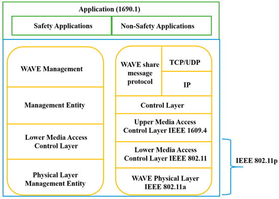 - WAVE: According to the IEEE published materials for the latest ITS standards [61], the WAVE IEEE 1609 describes an architecture, mechanism, sets of protocols, and interface, which are used to develop communication in the VANET environment, i.e., V2V and V2I communications [1]. Figure 3 shows the different standards of the WAVE architecture and its integration with the open system interconnection (OSI) model.