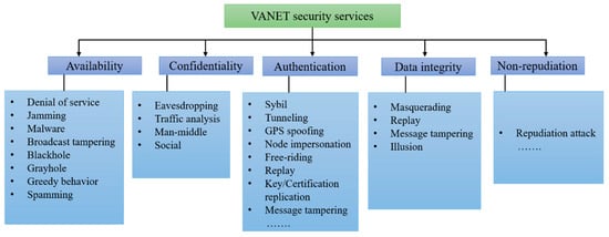 In the VANET security, it is necessary to mention the requirements that the system should be in-line with the appropriate network operation. Unable to fulfill these requirements may lead to possible threats or attacks in VANETs. The main security requirements are categorized into five main domains such as availability, confidentiality, authentication, data integrity, and non-repudiation [2,70]. Figure 4 shows the security services as well as their threats and attacks. These security services are discussed in this section.