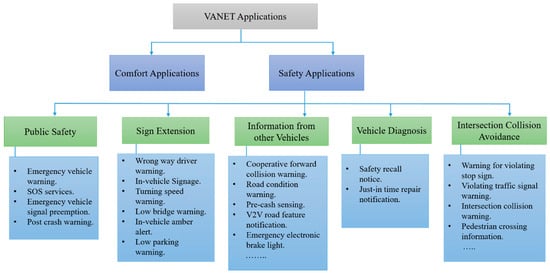 VANET is a type of mobile ad hoc network (MANET) with road routes, which aim to provide traffic safety, improve traffic flow, and enhance the driving experiences. It relies on transportation authorities for registering and managing the roadside units (RSUs) and onboard units (OBUs) [4]. An OBU is installed in every vehicle as a transmitter to communicate with other vehicles on the road, while RSUs are installed along the street with network devices. RSUs are used to communicate with the infrastructure and contain network devices for dedicated short-range communication (DSRC) [5]. VANETs are classified into two categories: vehicle-to-vehicle (V2V) and vehicle-to-infrastructure (V2I) communications [6]. In the V2V, vehicles can communicate with each other in order to exchange traffic-related information. In the V2I, vehicles can directly communicate with the infrastructure to exchange traffic information.