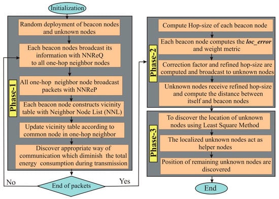 In this section, we proposed an energy-efficient novel DV-Hop localization algorithm. A traditional DV-Hop algorithm is completed in three phases: Firstly, the beacon nodes forward their location to the one-hop neighbor sensor nodes; secondly, hop-size distance of each beacon node is computed; and the positions of unknown nodes are discovered in the last phase. The proposed algorithm is also completed in three phases as depicted in Figure 2. Detailed description of the proposed algorithm is as following:
