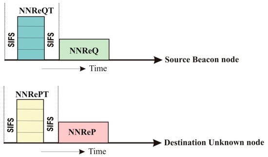 In the first phase of the proposed algorithm, beacon nodes discover their one-hop neighbor nodes by forwarding the Nearest Neighbor Request (NNReQ) and Nearest Neighbor Reply (NNReP) packets same as 802.11. Additional two packets are also included in the proposed algorithm to avoid collision of packets during transmission. These two packets are Nearest Neighbor Request Tone (NNReQT) and Nearest Neighbor Reply Tone (NNRePT) shown in Figure 3 and are forwarded before broadcasting NNReQ and NNReP. Initially, the NNReQT is broadcasted by beacon nodes called source beacons () bounded with short inter-frame space (SIFS) which is used between each frame to ensure that no other radios are transmitting during the transmission. Information packets are forwarded for finding the neighbor unknown nodes called the destination unknown nodes after the SIFS time has elapsed. Next, the NNReQ packet is broadcasted if the NNReQT is received successfully by neighbor nodes. Now, transmits the NNRePT followed by NNReP packets to . The format of NNReQ and NNReP are as follows: