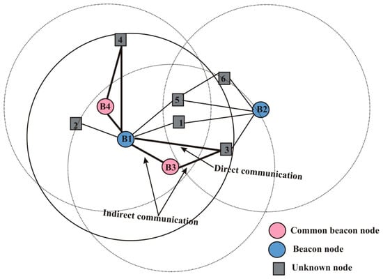 Neighbor Set: Each beacon node enlists its neighbor beacon nodes within one-hop and these nodes can act as a common node during transmission. The common beacon node between the unknown node and beacon node is indicated by and selected only when it is capable of reducing the overall energy consumption as compared to direct communication. The unknown nodes which have direct communication with beacon node b are denoted with and with indirect communication are denoted by .