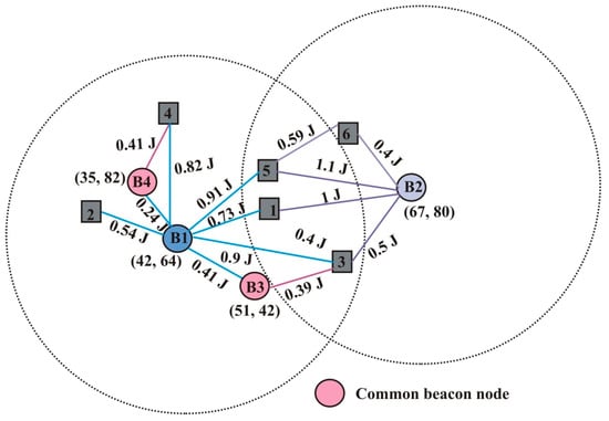 In this way, each beacon node enlists its one-hop neighbor unknown nodes in a neighbor node list (NNL) within its transmission range. Let be the maximum energy, represent the minimum energy, and be the required transmission energy of the beacon node . The transmission energy () can be adjusted within the range of maximum and minimum energy, . Let be the minimum energy required for data transmission between the b and u nodes and it is computed as follows: