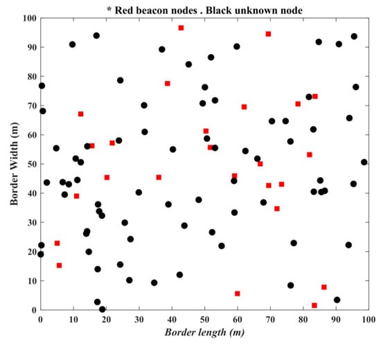 The simulated results of the proposed algorithm are shown in this section. The simulated results are evaluated in MATLAB with Intel (R) Core(TM) i3-3217 CPU @1.80 GHz. The network scenario is considered static in nature and 100 sensor nodes are randomly deployed with 25% beacon nodes and remaining unknown nodes, as presented in Figure 6. The parameters used in the simulation are presented in Table 4.